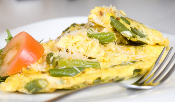 Почистете и сварете фасула, отцедете го и го нарежете. Разбийте яйцата, смесете ги с фасула и ги изпържете в загрята мазнина. Изсипете омлета в голяма чиния, поръсете го с настърган кашкавал и магдан...