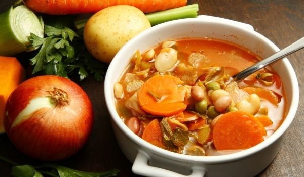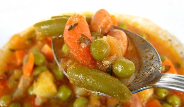 Нарежете морковите на колелца, лука на филийки, а месото на хапки. Задушете ги в олиото. Прибавете последователно нарязаните чушки, розичките карфиол, бланширания зелен фасул, нарязания на кубчета па...