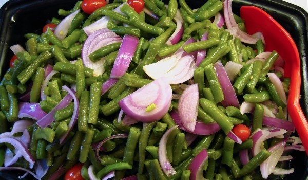 Зелената салата се измива и се разделя на листа, които се нареждат в чиния за сервиране. Картофите се обелват, нарязват на кубчета и заедно със зеления фасул се сваряват в подсолена вода. Отцеждат се...
