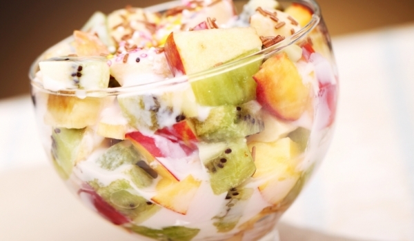 Всичко се нарязва на средно големи кубчета, добавят се кокосовите стърготини, бонбоните маршмелоу, цеденото кисело мляко и сметаната.