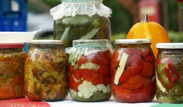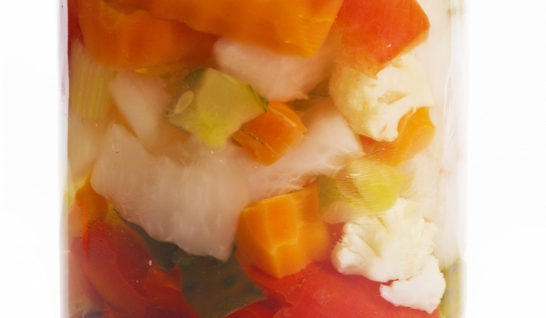 Напълваме буркана с посочените продукти, доливаме го с вода, затваряме с капачка и стерилизираме 10 мин. Посочените продукти са за 1 буркан – 800 мл.