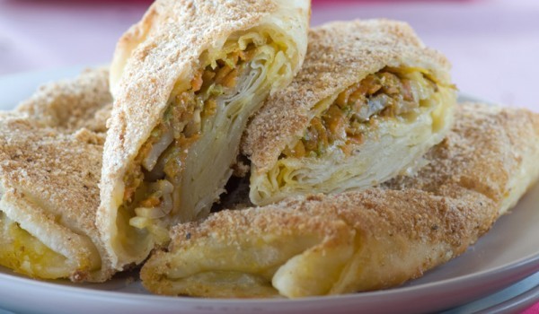 Омесва се тесто без маслото от посочените продукти. Втасва 50 минути. Разделя се на топчета с големина на ябълка. Отделно се разбърква плънката до хомогенност. Всяко топче се разточва на тънък лист,...