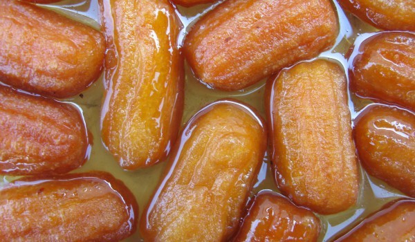 Смесете всички съставки за сиропа и сложете да се варят 1-2 минути след кипването. Оставете да се охлади. Разбийте яйцата със захарта и олиото, добавете алкохола и пресятото с бакпулвера брашно. Разб...