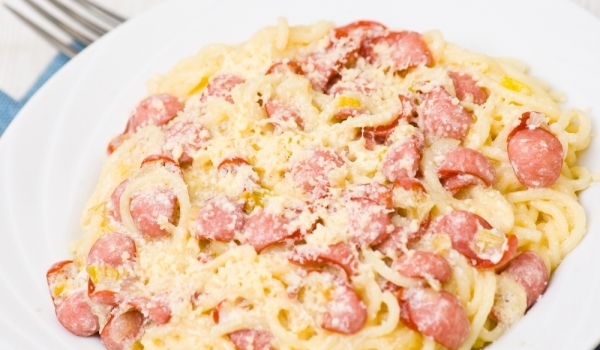 Спагетите се сваряват добре. Докато са още топли, се добавят кетчупът, майонезата и кренвиршите, които предварително сме нарязали на ситно. Докато ястието е все още топло може да добавим настърган ка...