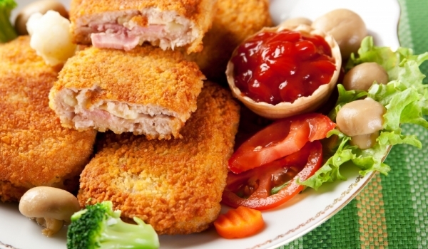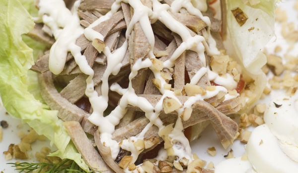 Месото се осолява, поръсва се с черен пипер и се запържва. Охлажда се, нарязва се на кубчета и се смесва с настъргания кашкавал и орехите. Кетчупът се смесва с майонезата и нарязания магданоз и с то...