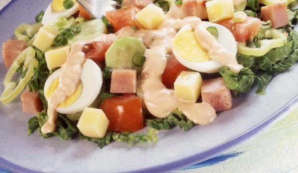Почистете зеленчуците и сварете твърдо яйцата. Нарежете доматите и краставиците на не много едри парчета, а шунката и кашкавал на дребни кубчета. Овкусете със сол, черен пипер и леко разбъркайте. Сип...