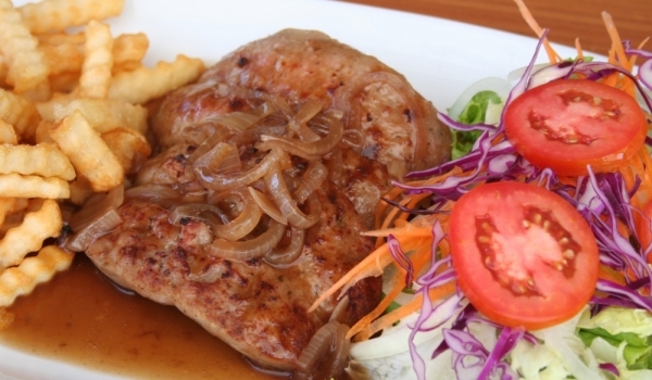Свинските пържоли леко се начукват и се поръсват с малко сол и млян черен пипер. Всички останали съставки без дафиновите листа и виното се разбъркват. Пържолите се подреждат в подмазнена йена и отгор...