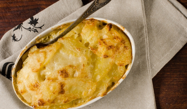 Обелете и настържете картофите на ситно ренде. Прибавете настърганото сирене, част от маслото, лимонов сок, ситно нарязан джоджен и две от яйцата. Разбъркайте добре. В отделен съд разбийте сметаната...