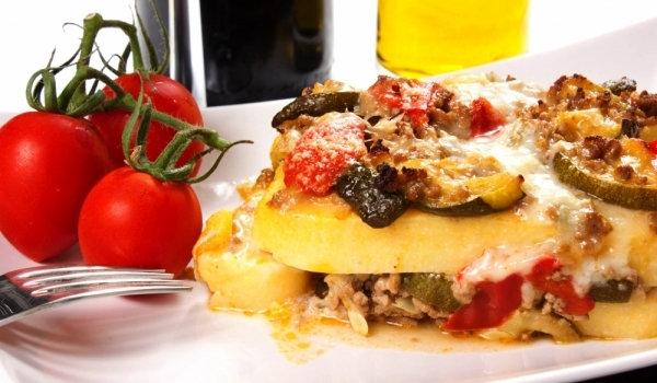 Нарежете патладжаните на кръгове и ги посолете. След като се отдели горчивият им сок, изплакнете и ги подсушете. Почистете доматите и подварените картофите и ги нарежете на също на кръгчета. Намазне...