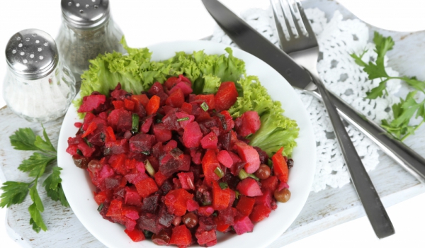 Морковите и картофите се сваряват заедно, а цвеклото отделно. Обелват се и се нарязват на кубчета. Добавят се нарязаното зеле, кисели краставички, червен лук и се поръсва с черен пипер. Приготвя се...