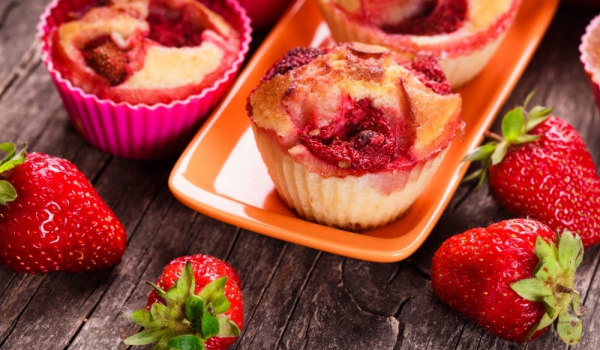 В купа смесете брашното, бакпулвера и солта. В отделна купа разбъркайте млякото, яйцето, захарта и олиото. Разбърквайте до пълното разтваряне на захарта. Ягодите се смесват с 2 лъжици от сместа в браш...