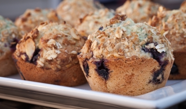 Смесете овесените ядки с киселото мляко и ги оставете да набъбнат. Смесете в купа сухите съставки - брашно, бакпулвер, сол, содата, канелата и орехите. Отделно разбийте яйцето, олиото, захарта и вани...