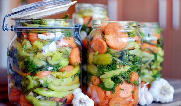 Разтворете аспирина във водата. Измийте морковите и ги нарежете на колелца. Запечете леко чушлета. Нарежете останалите зеленчуци и смесете всичко заедно. Оставете да престоят така 24 часа. Напълнете...