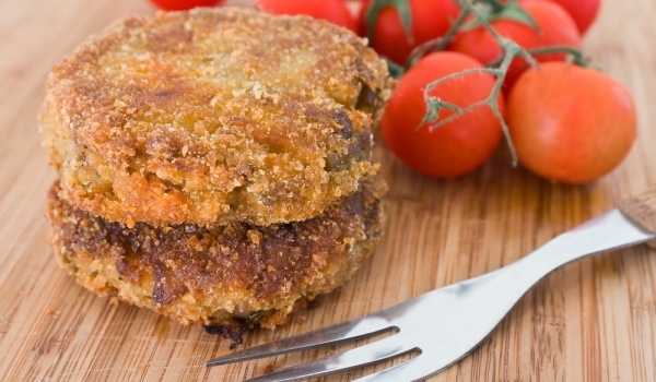 Нарежете почистените патладжани на кръгчета с дебелина 0.5 см. Посолете ги и при желание оставете да се отцедят от горчивия сок. Овалвайте ги в брашно и ги изпържете в сгорещено олио. Подреждайте изпъ...