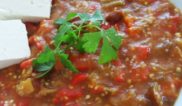 Домата се изсипва в тенджерка със сгорещеното олио. Към него се добавят нарязаните на ситно патладжани и чушки, чесъна и подправките. Наливат се една-две чаши топла вода с размитото в тях брашно /за с...