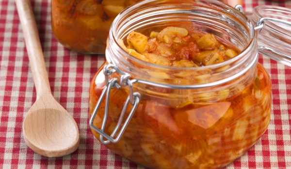 Загряваме мазнината и пържим ситно нарязаните лук и чесън до омекване. Когато се изпържат добавяме чилито е пържим още 2 минути. В тигана изсипваме нарязаните на кубчета патладжани и домати, наситнен...