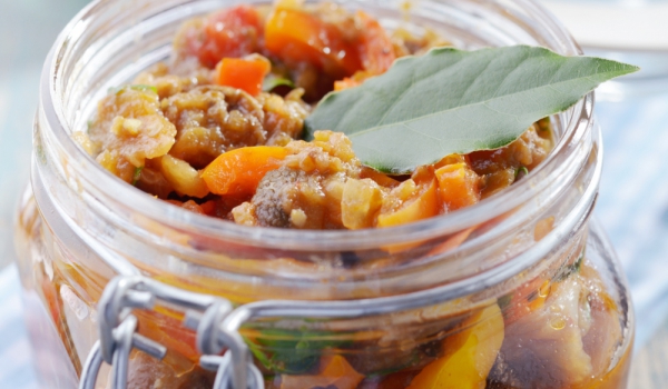 Обелваме опечените чушки, почистваме ги от семената и нарязваме на лентички. Запичаме леко патладжаните, обелваме ги и режем на кубчета. Настъргваме на едро морковите, счукваме чесъна и нарязваме ма...
