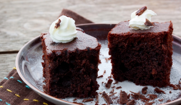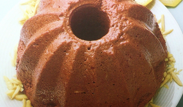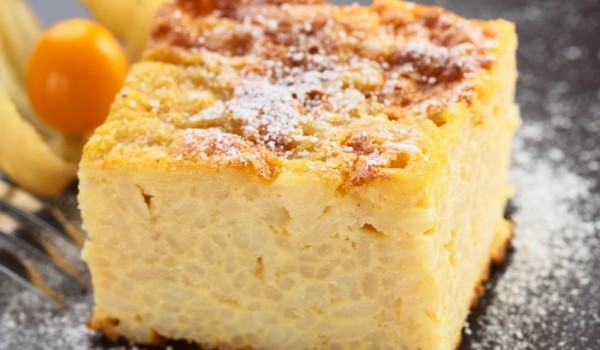 Разбийте млякото, олиото и захарта, прибавете и останалите продукти. Изсипете полученото тесто в намаслена тава и го изпечете в умерена фурна. По желание гарнирайте с разбита сметана.