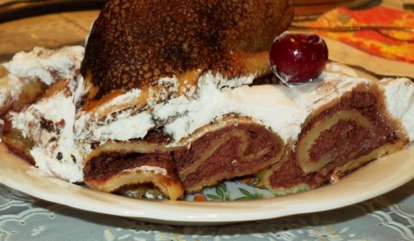 От изброените продукти приготвяме палачинково тесто и изпичаме средно дебели палачинки в леко намазнен тиган. Разбиваме двата крема поотделно. С кафявия мажем палачинките и ги навиваме като баница. Сл...