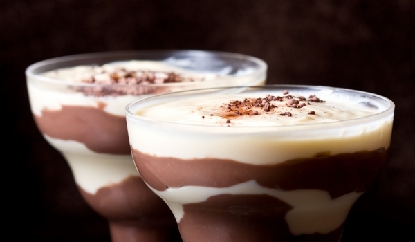 Загрейте по 500 мл прясно мляко в 2 тенджерки. Разтворете двата вида пудинг във вода според указанията на опаковката. Към прясното мляко разбъркайте по равно количество захар, след като се загрее. Ра...