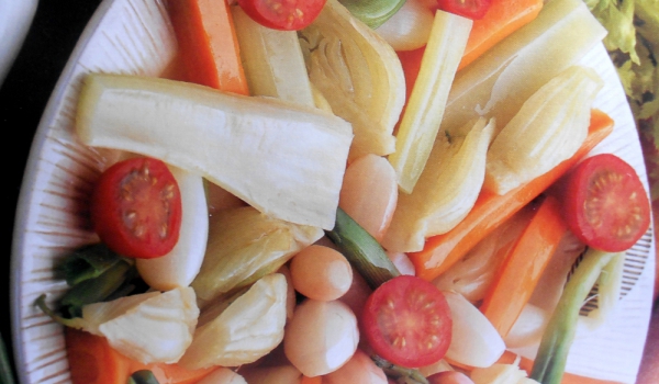 Кардунът се вари в подсолена и вряща вода около 20 мин. Добавя се карфиолът, артишокът за 5 мин., целината и резенето. Изцеждат се и се оставят да изстинат на пълно. Лукът се запържва в зехтина за 2...