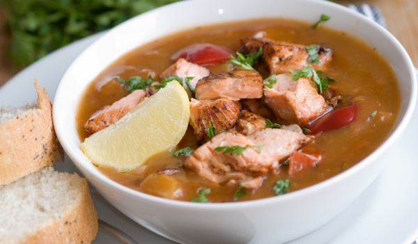 Лукът и резенето се задушават до пълно омекване. Прибавят се бульонът, виното, доматите, дафиновият лист, захарта, солта и черният пипер. Оставя се да къкри около 10 мин. Кожата и костите на рибата с...