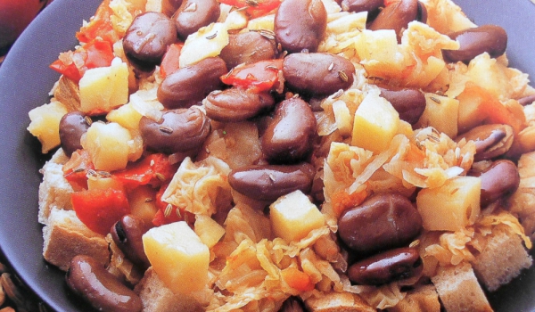 Бобът се вари около час, докато омекне. Лукът се запържва в 4 с.л. от зехтина. Добавят се картофите, зелето, доматите, резенето и се оставя да къкри около 10 мин. Прибавя се достатъчно вода. Осолява...