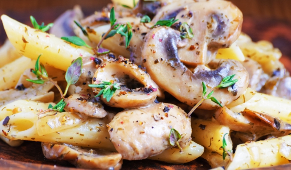 Гъбите се поливат с лимоновия сок и се поръсват с мащерката и лимоновата кора. Разбъркват се и се оставят встрани за няколко минути. Синьото сирене се смесва със сметаната, солта и черния пипер. Гъб...