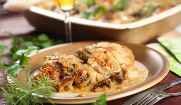 Накиснете предварително гъбите във вода. Нарежете пилешкото на парчета, объркайте го със сол, млян черен пипер и мащерка и оставете да престои. Загрейте маслото на слаб огън и задушете ситно накълцан...
