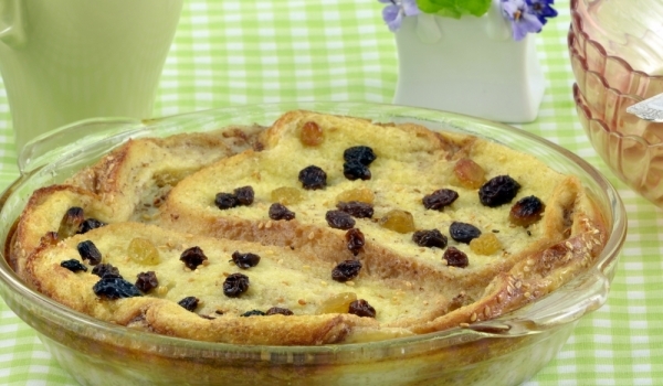 Накиснете стафидите в рома. Всяка филия хляб намажете с масло и с конфитюр и я нарежете на 2 или 4 части. Добре намаслете стените и дъното на формата за печене. Подредете 1/2 от парчетата хляб с нама...