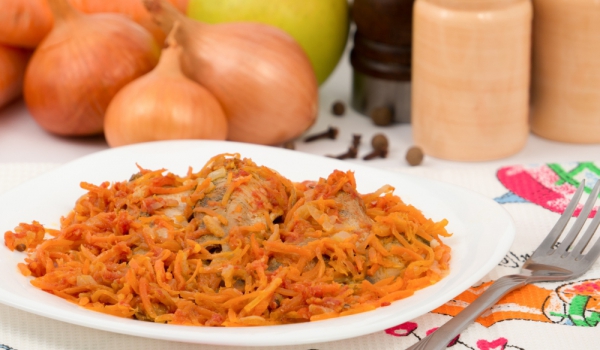 Рибата се нарязва и се нарежда в тенджера, намазана с мазнина, като се отделят две парчета. Те се сваряват на бульон и с този бульон се залива рибата в тавата. Добавят се целината и лукът, нарязаните...