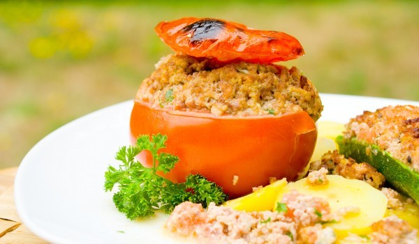 Издълбайте почистените домати, като отрежете и запазите капачетата. Накълцайте ситно лука и го запържете в маслото. Добавете половината вътрешности на доматите, нарязани ситно. Оставете да се позапърж...