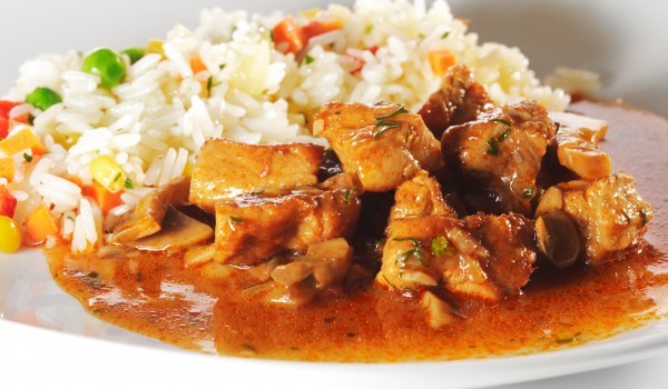 Нарежете месото на късове и го запържете равномерно в олиото, след което добавете накълцания кромид лук. След като омекне, добавете доматеното пюре, изчакайте да се позапържи и добавете брашното. Сле...