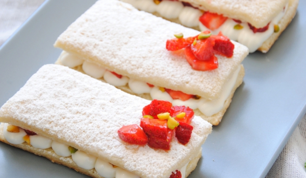 От тестото се разточват четири кори с размери 30 на 8 сантиметра. Слагат се в тава, набождат се с вилица и се пекат на 200 градуса до златисто. Изстудяват се. Сметаната се разбива, добавя се набъбнал...