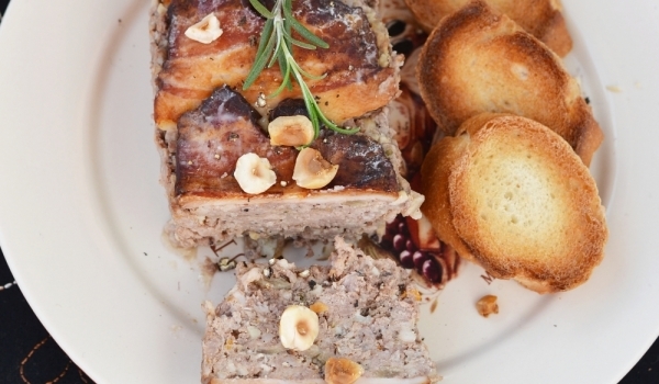 Изрежете месото от гърдите на пилето. Смелете 2 пъти в машинка за мелене останалото месо, сланината, свинското месо, добавете корените, брендито, черния пипер и претрийте през цедка. Разбъркайте смес...
