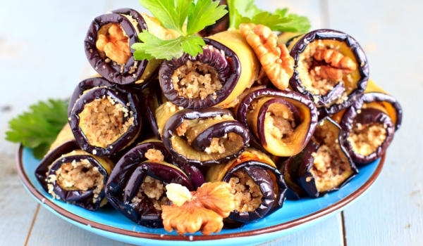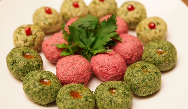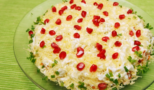 Яйцата и орехите се нарязват на ситно. Лукът, копърът и магданозът се режат на ситно, смесват се с омекналото масло и ореховата смес. Поръсва се със сол и със зърната от нар.