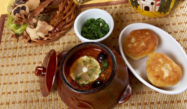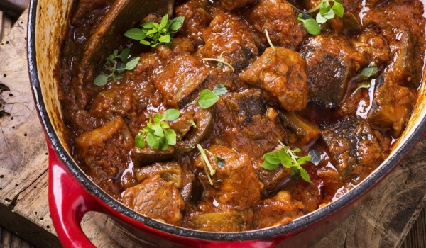 Нарежете месото на парченца, добавете ситно нарязания лук и изпържете всичко в олио. Поръсете с брашното, добавете доматено пюре, обелените и нарязани краставички, чесъна. Посолете и залейте с винот...