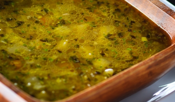 Месото заедно с нарязаните чушки се сварява в бульона с ригана, чесъна и солта. Месото се изважда и нарязва, а бульонът се прецежда. Зеленият лук се нарязва и запържва в мазнината. Залива се с бульон...