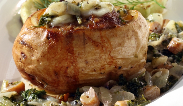 Изпечете измитите картофи. Междувременно изпържете ситно нарязания лук в маслото, поръсвате брашното и запържете. Залейте с бульона, виното, оцета, прибавете сол и черен пипер на вкус. Оставете смес...