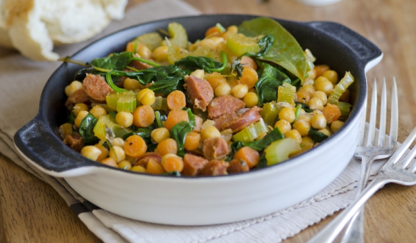В голяма тенджера се загряват 2 - 3 с л зехтин след което се прибавя салама нарязан на дребно и запържва няколко минути. Добавят се ситно нарязаните лука, чесънът и целината. Тенджерата се похлупва...