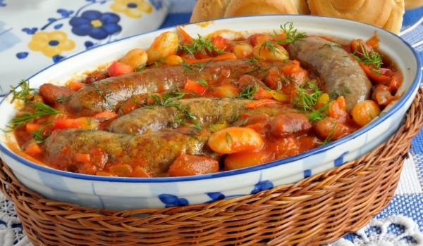 Първо, свинското и наденицата трябва да сготвите в глинен съд. След като са готови, ги извадете и в същия съд сложете лука и чесъна и разбърквайте, докато омекнат. Върнете месото при лука заедно с пи...