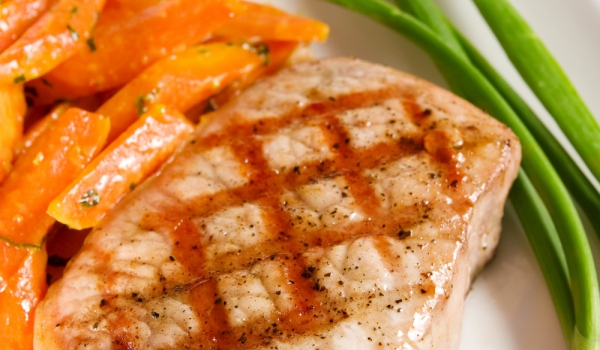 Смесете в купа зехтина, лимоновия сок, кимиона, червения пипер и свинското. След това сложете свинското да се пече на нагорещена и намаслена скара. Междувременно направете салатата от морковите и мас...