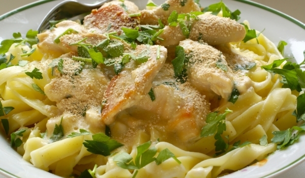 Сварявате пастата, отцеждате я и я оставяте да се охлади. Пилешките гърди овкусете с малко сол и къри и ги изпържете в олиото. Ананасът нарязвате на парченца, а половината му сос смесвате със сметана...