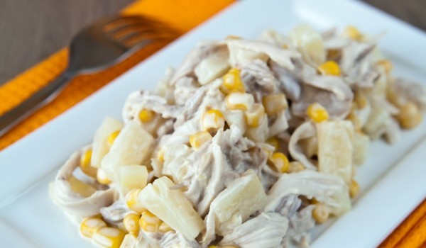 Сварете пилешкото в подсолена вода и го накъсайте в салатена купа. Прибавете кубчетата нарязан ананас, предварително накиснат за 10 минути в лимонов сок. Объркайте с царевицата салатата и добавете с...