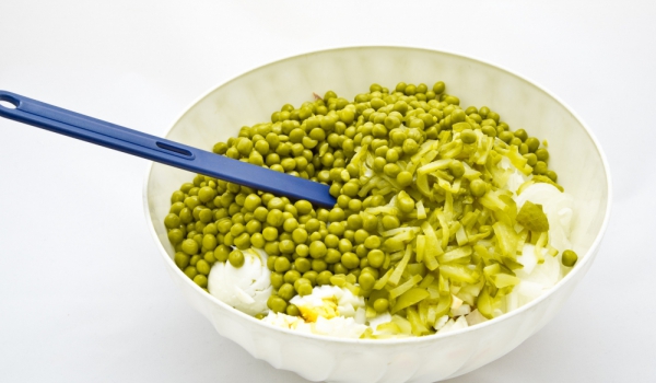 Морковите се сваряват, обелват се и се настъргват. Яйцата се нарязват на ситно. Грахът се отцежда от течността в консервата и се измива. Лукът се нарязва на ситно. Добавя се грахът, яйцата и моркови...