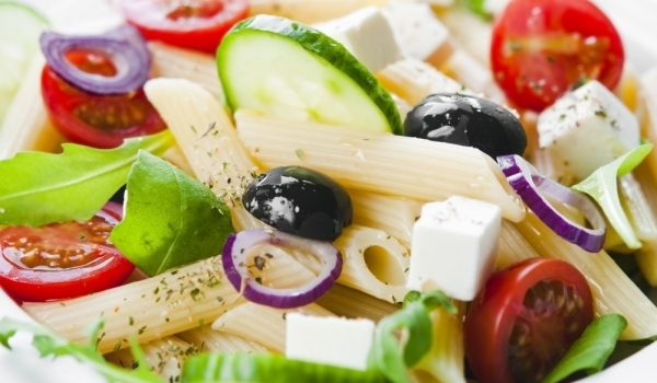 Сварете макароните в кипяща и подсолена вода за 11 минути, след което ги отцедете и ги разбъркайте с лъжица зехтин. Почистете всички зеленчуци. Нарежете на половинки доматите, краставиците - на кръгч...