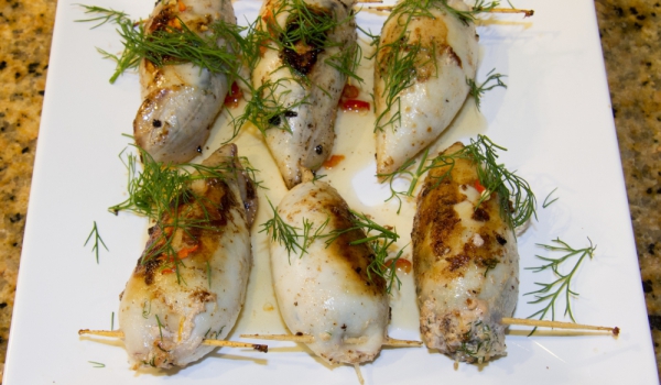 Калмарите се почистват и се измиват. Сваряват се за около 20 секунди. Приготвя се плънка, като яйцата се режат на ситно, добавят се галетата, нарязаният на ситно магданоз, млякото, зехтинът и подправ...