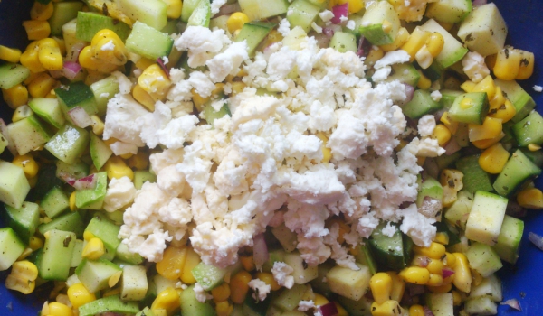 Почистете всички зеленчуци. Нарежете краставицата и тиквичката на дребни кубчета и ги смесете в купа. Разполовете кочана варена царевица и с помощта на нож остържете зърната от двете половини. Добаве...