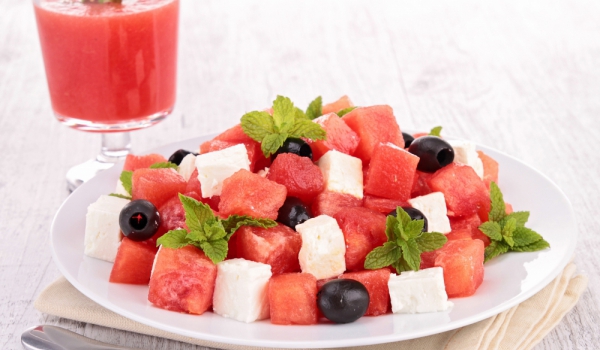 Отстранете кората и семето от парчетата диня. Нарежете останалата част на по-малки триъгълни парчета. Смесете парчетата диня със сиренето фета. Прибавете слънчогледовото и тиквеното семе заедно с масл...