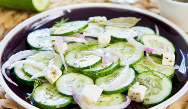 Нарежете краставиците и лука на кръгчета и ги сложете в голяма купа. Овкусете зеленчуците със солта и разбъркайте. Оставете ги да престоят на студено място около 5-10 минути. Прибавете ябълковия оцет,...